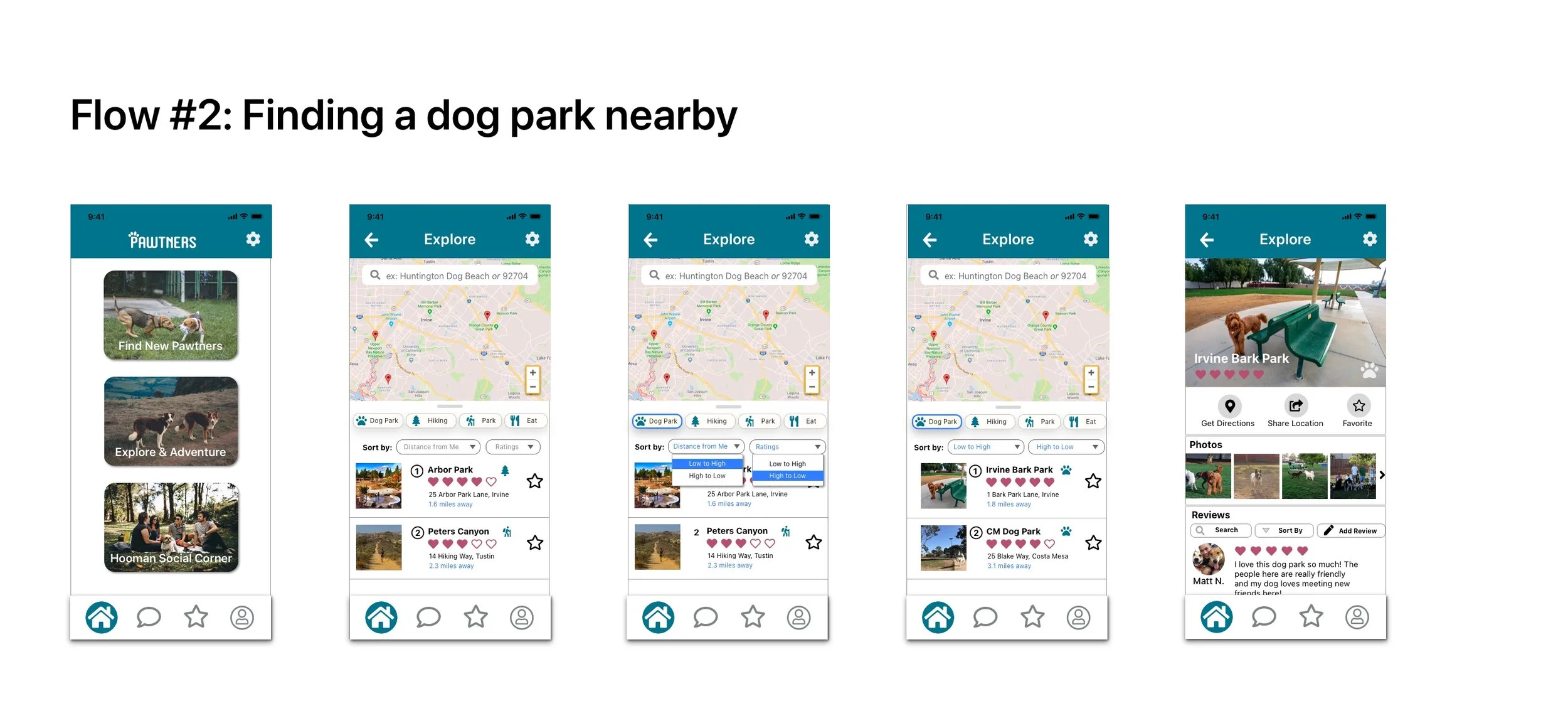 From the sketches and low-fidelity wireframes, I was able to create high-fidelity versions of the screens while staying consistent by referring to the style guide. The first three images of the flows below were all my first pass at creating high-fidelity screens. It was insightful to be able to go back and refer to these screens as time progressed and make fixes to improve Pawtners.